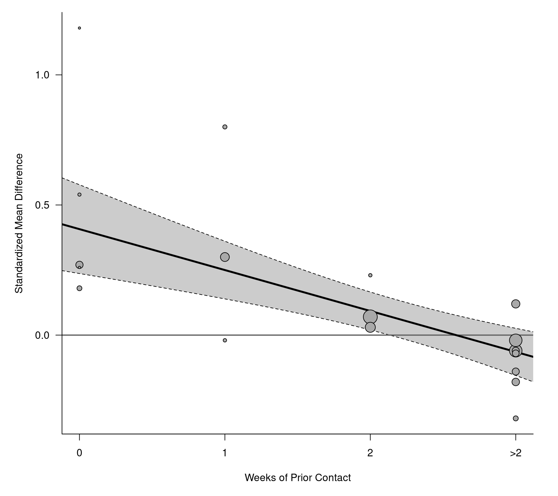 The predicted (average) effect as a function of the weeks of prior contact (with 95% CI bounds) is also added to the plot. The resulting plot is shown below.