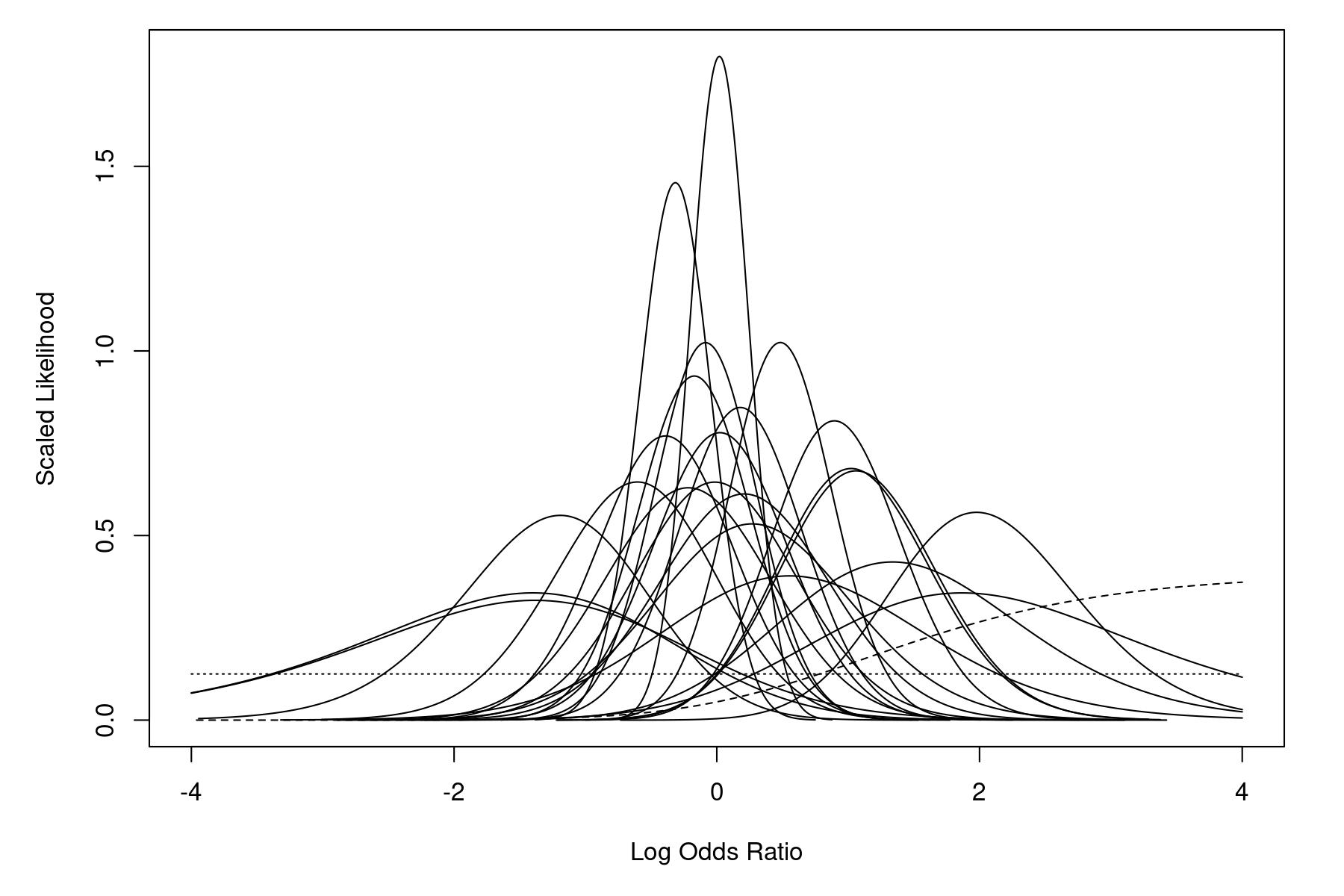 One study (number 10) has a single zero cell (none of the patients in the treatment group experienced persistent or recurrent bleedings), which implies that the MLE of the odds ratio is infinite. The dashed line in the figure corresponds to this study. Also, one study (number 14) has two zero cells (none of the patients in the entire study experienced persistent or recurrent bleedings), which implies a flat likelihood for the odds ratio. The dotted line in the figure corresponds to this study.1) However, for most studies, the likelihood is concentrated within the range $-1$ to $1$. Hence, the MLE of the log odds ratio should also fall somewhere within this range.