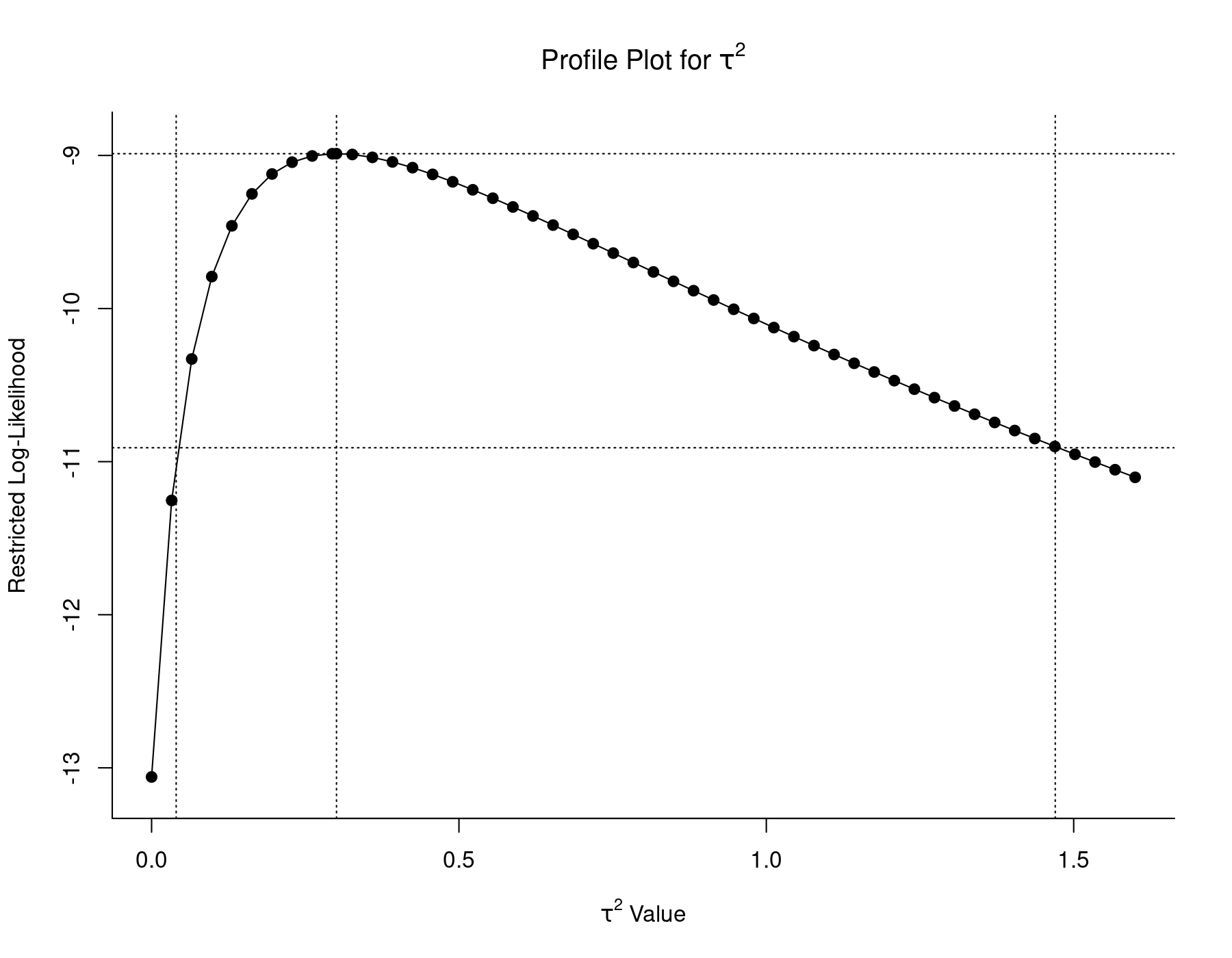 The middle vertical line indicates the ML estimate of $\tau^2$, with the upper horizontal line denoting the corresponding log-likelihood. The lower horizontal line corresponds to this log-likelihood value minus 3.84/2. Therefore, the two $\tau^2$ values with log-likelihoods equal to this value are the bounds of a 95% profile likelihood CI for $\tau^2$. These values are approximately equal to 0.03 and 1.13, as indicated by the left and right vertical lines.