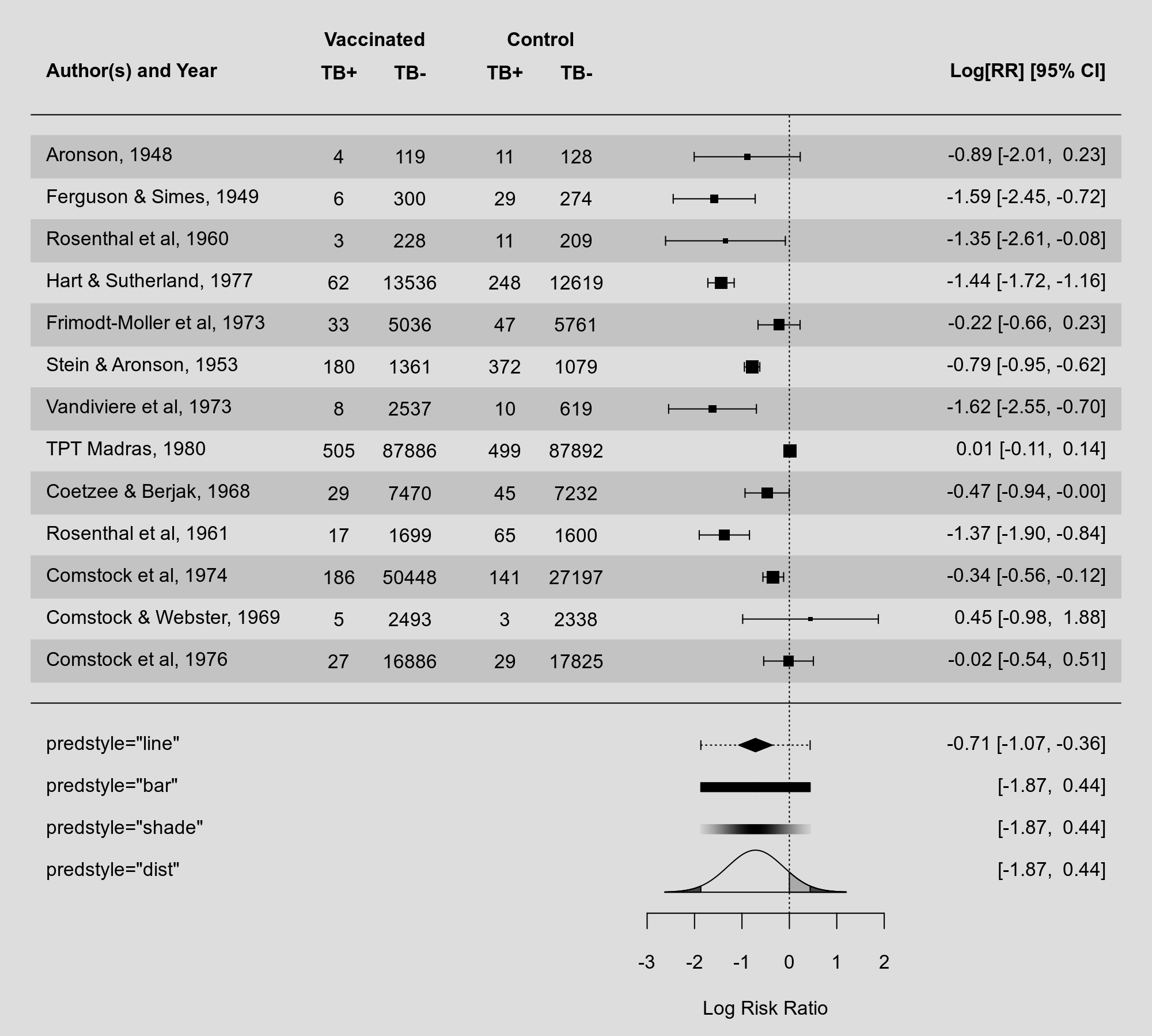 There are now also multiple styles for drawing the prediction interval (via the predstyle argument). Instead of a dotted line superimposed on the polygon (which is easily confused with a confidence interval for the average effect), predstyle="bar" draws a bar below the polygon, predstyle="shade" shades the bar in accordance with the density of the prediction distribution, and predstyle="dist" draws out the entire prediction distribution (and shades the regions beyond the prediction interval bounds and the region below/above zero). The forest plot below illustrates these different possibilities.