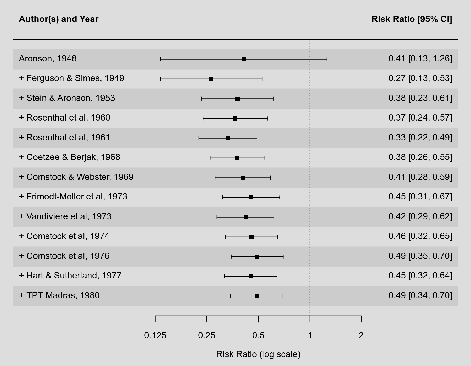 library(metafor) ### calculate (log) risk ratios and corresponding sampling variances dat <- escalc(measure="RR", ai=tpos, bi=tneg, ci=cpos, di=cneg, data=dat.bcg) ### fit random-effects models res <- rma(yi, vi, data=dat, slab=paste(author, year, sep=", ")) ### cumulative meta-analysis (in the order of publication year) tmp <- cumul(res, order=year) ### cumulative forest plot forest(tmp, xlim=c(-4,2), at=log(c(0.125, 0.25, 0.5, 1, 2)), shade=TRUE, atransf=exp, digits=c(2L,3L), cex=0.85, header="Author(s) and Year")