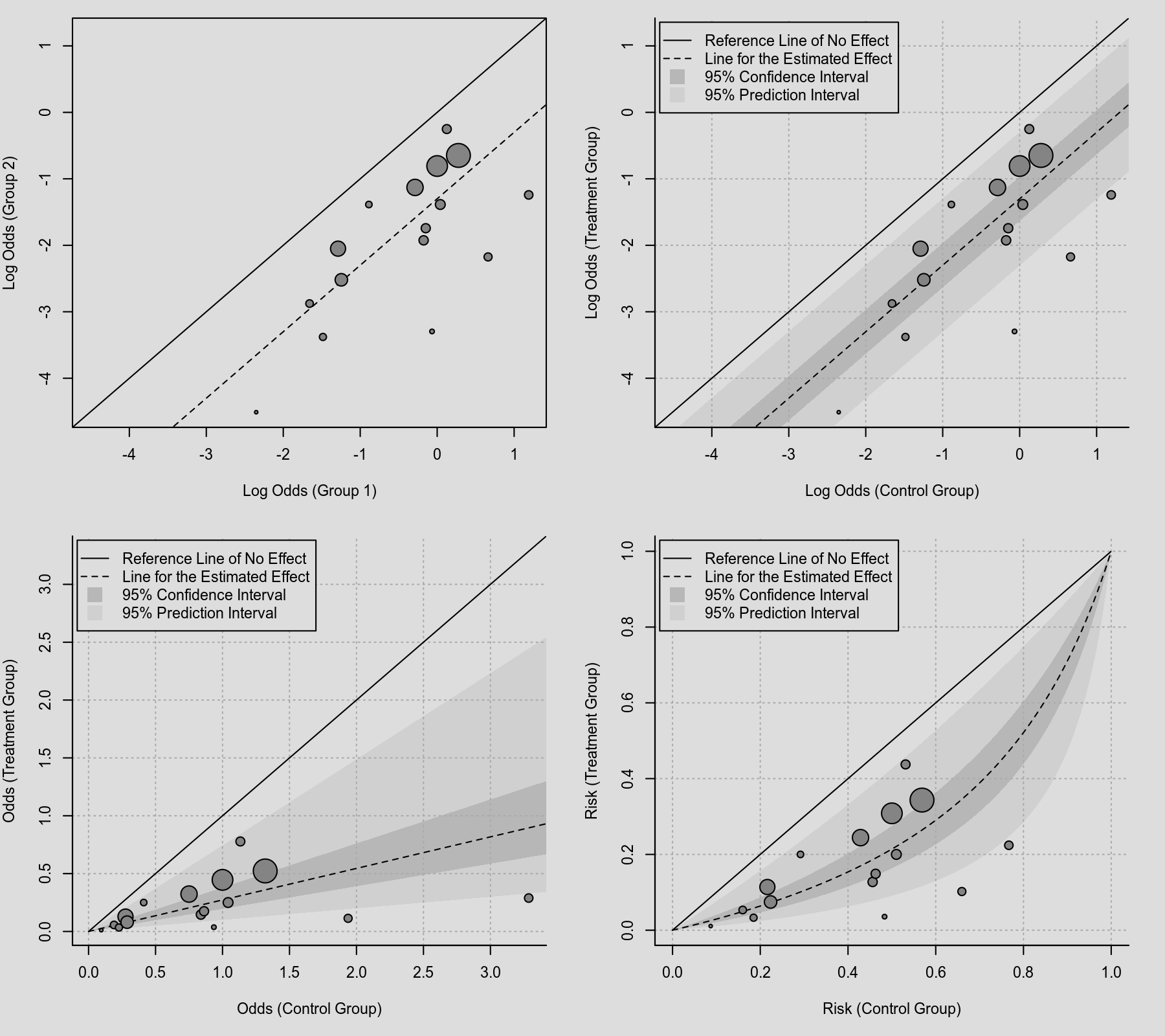 library(metafor) ### fit random-effects model dat <- dat.damico2009 res <- rma(measure="OR", ai=xt, n1i=nt, ci=xc, n2i=nc, data=dat) ### set up 2x2 array for plotting par(mfrow=c(2,2)) ### decrease the overall point sizes a bit par(cex=0.7) ### default plot with log odds on the x- and y-axis labbe(res) ### plot with some customization labbe(res, ci=TRUE, pi=TRUE, grid=TRUE, legend=TRUE, bty="l", xlab="Log Odds (Control Group)", ylab="Log Odds (Treatment Group)") ### plot with odds values on the x- and y-axis and some customization labbe(res, ci=TRUE, pi=TRUE, grid=TRUE, legend=TRUE, bty="l", transf=exp, xlab="Odds (Control Group)", ylab="Odds (Treatment Group)") ### plot with risk values on the x- and y-axis and some customization labbe(res, ci=TRUE, pi=TRUE, grid=TRUE, legend=TRUE, bty="l", transf=plogis, lim=c(0,1), xlab="Risk (Control Group)", ylab="Risk (Treatment Group)")