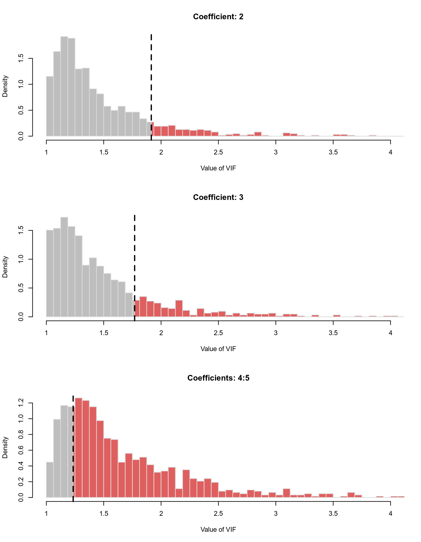 The vertical dashed lines indicate the observed (G)VIF values, which we can see are relatively large for the second and third model coefficients, corresponding to the year and ablat variables.