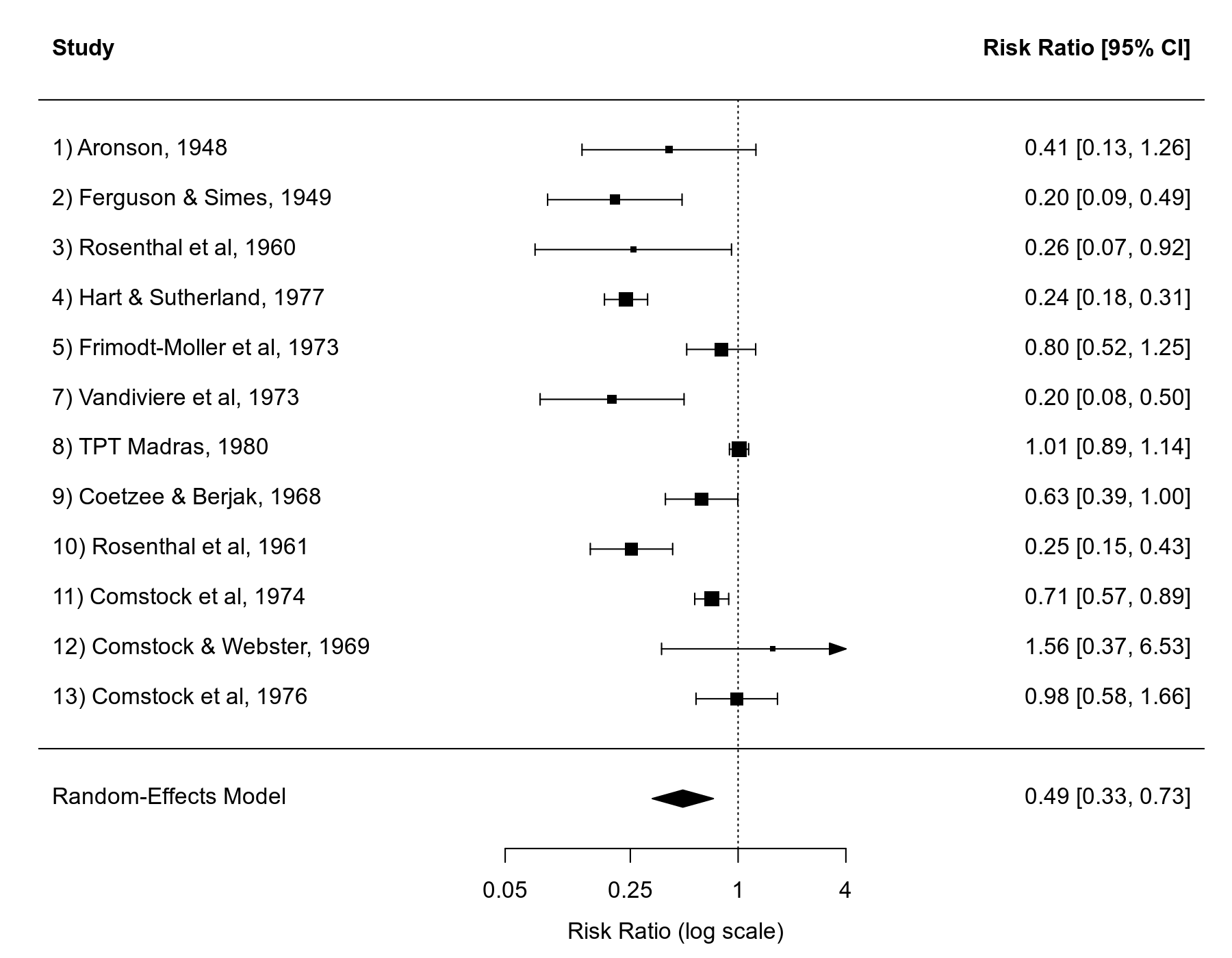 dat <- escalc(measure="RR", ai=tpos, bi=tneg, ci=cpos, di=cneg, data=dat.bcg) res <- rma(yi, vi, data=dat, slab=paste0(trial, ") ", author, ", ", year))